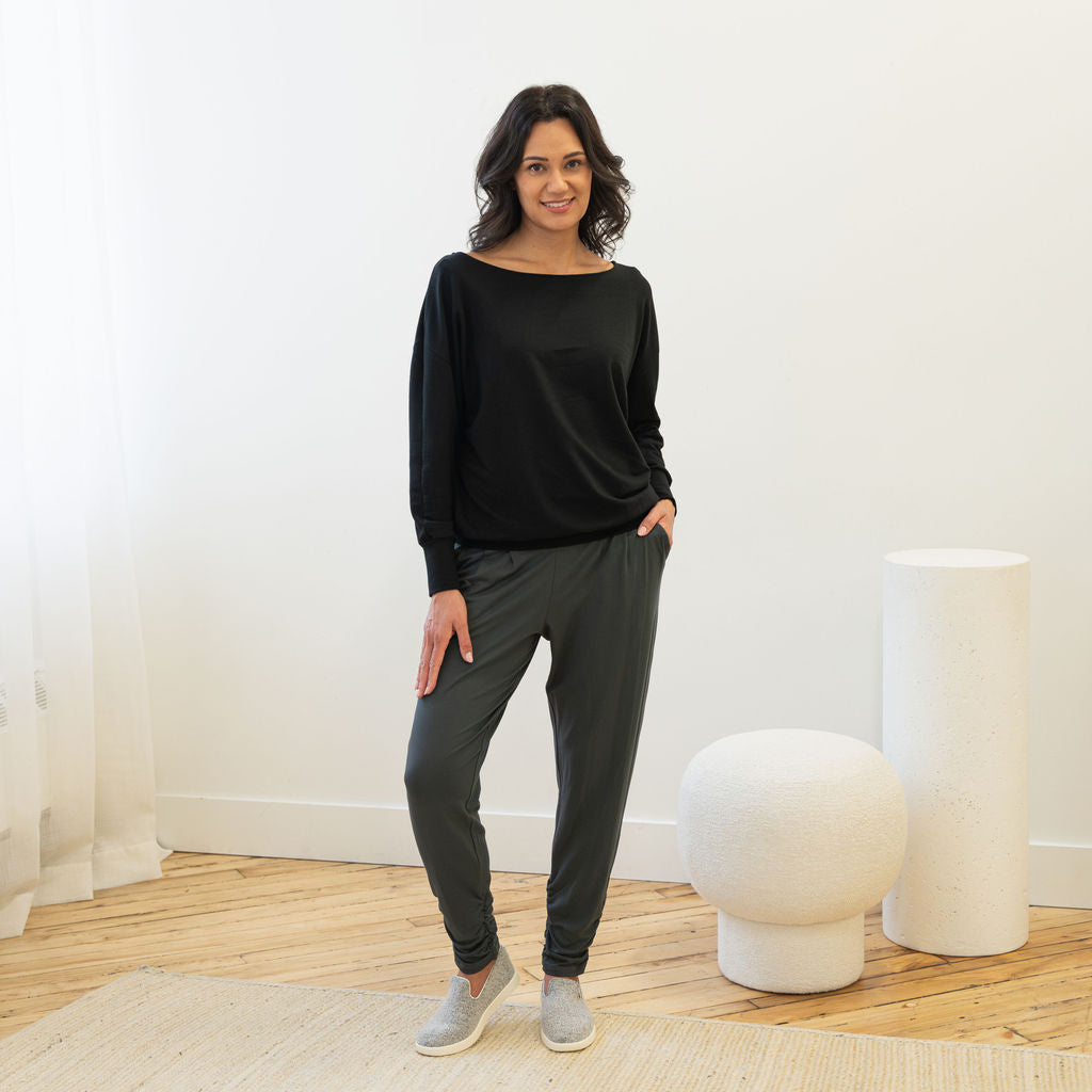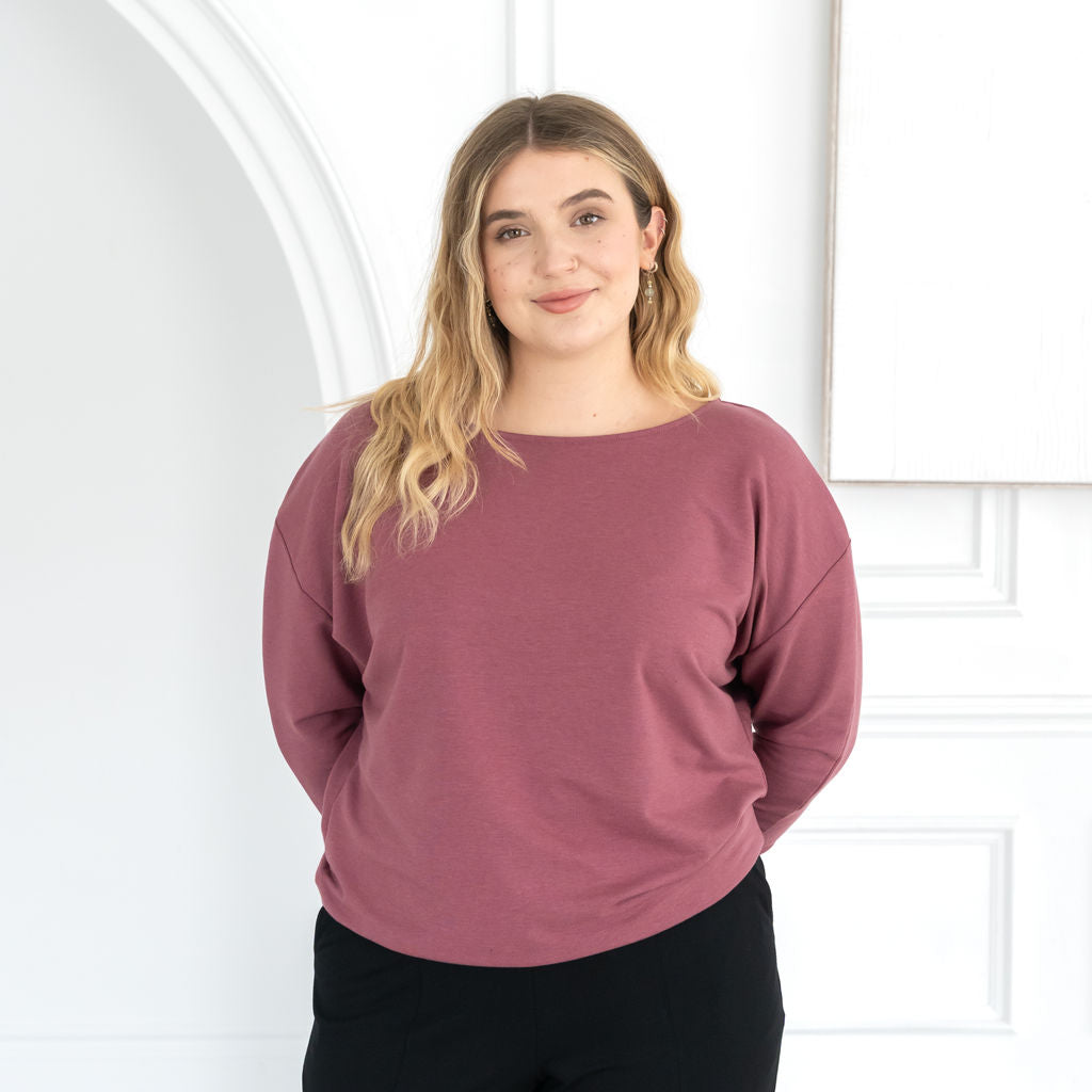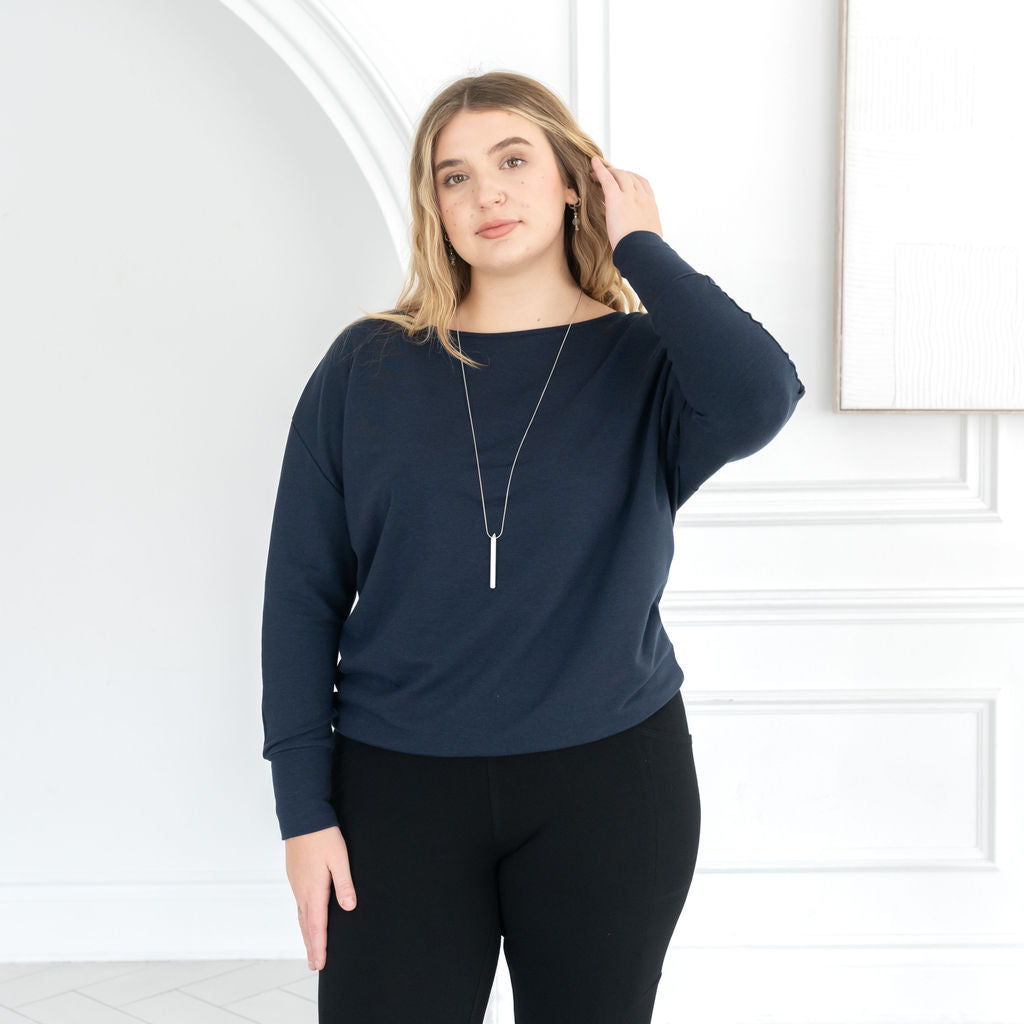 The Dressy Sweatshirt in MERINO is made from a French Terry blend of Rayon from Bamboo, Merino Wool and Spandex. The Merino Wool is non-mulesed, and cruelty-free. The fabric is OEKO-TEX® STANDARD 100 certified to be free from harmful chemicals.