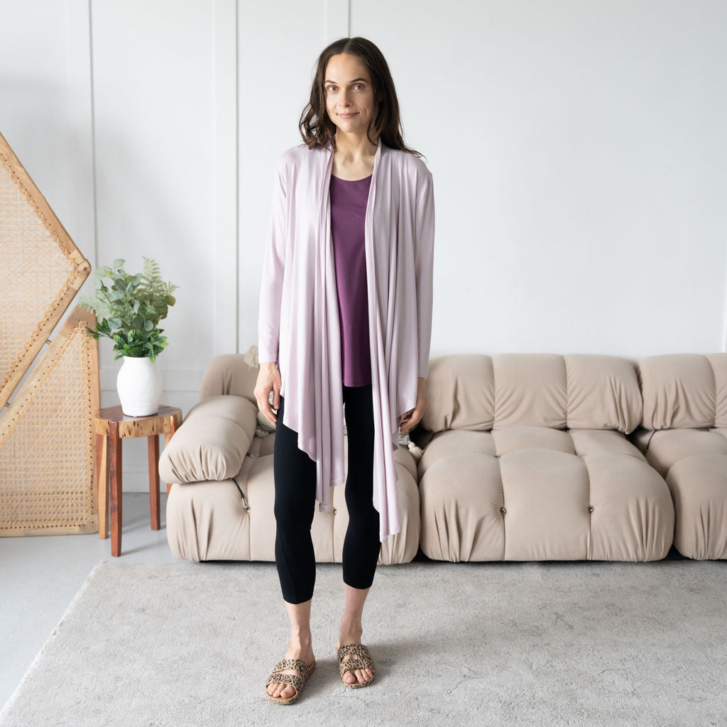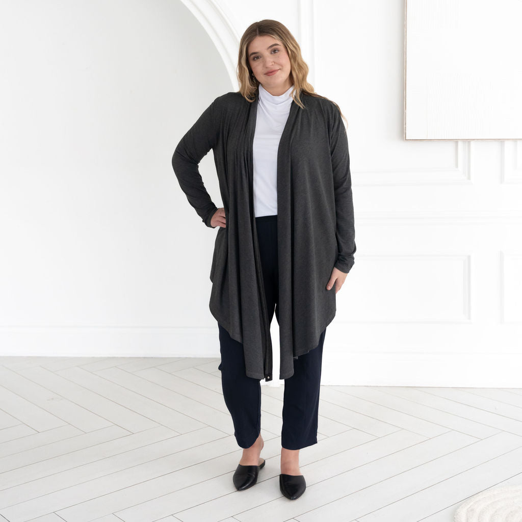 1 wrap, endless possibilities. This feather-light bamboo-cotton cardigan clips into 5 distinct silhouettes—wear it as a draped long wrap for weekend brunch, snap up to a high-neck top for studio sessions, or pack it flat for on-the-go layering. Crafted in Canada from OEKO-TEX® certified bamboo fibres, it folds into your tote for effortless travel style. Machine-washable and sustainably spun, it’s the eco-friendly travel knit you’ll reach for again and again.