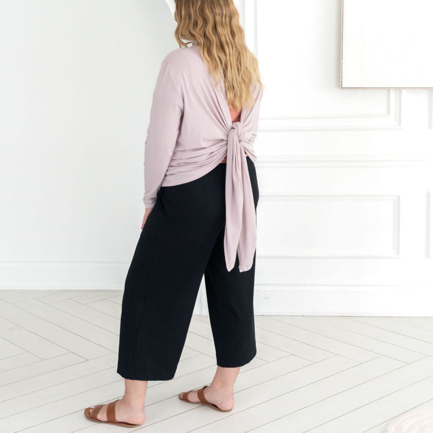 • Style as an open cardigan, draped front cardigan, wrap top, twist front top and reversed with the knot in the back.