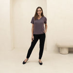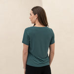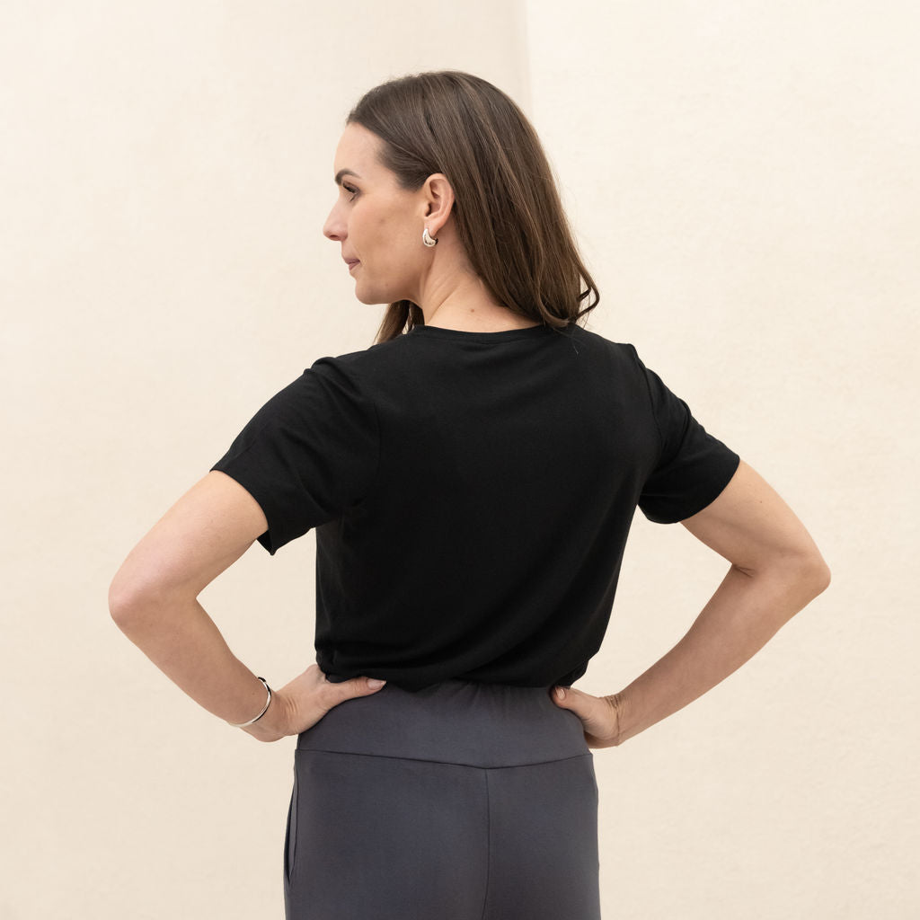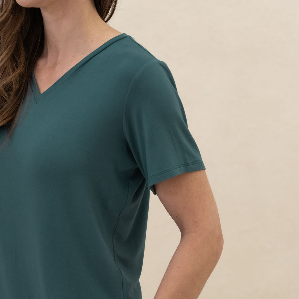 Meet the Going Places V-neck Tee—a timeless essential for your wardrobe. Crafted from breathable, 4-way stretch Rayon from Bamboo blend fabric. Smooth and never see-through, it features a streamlined fit that flatters at the high hip. Perfect for layering or solo wear, this durable tee is designed to outlast trends and countless wears and washes.