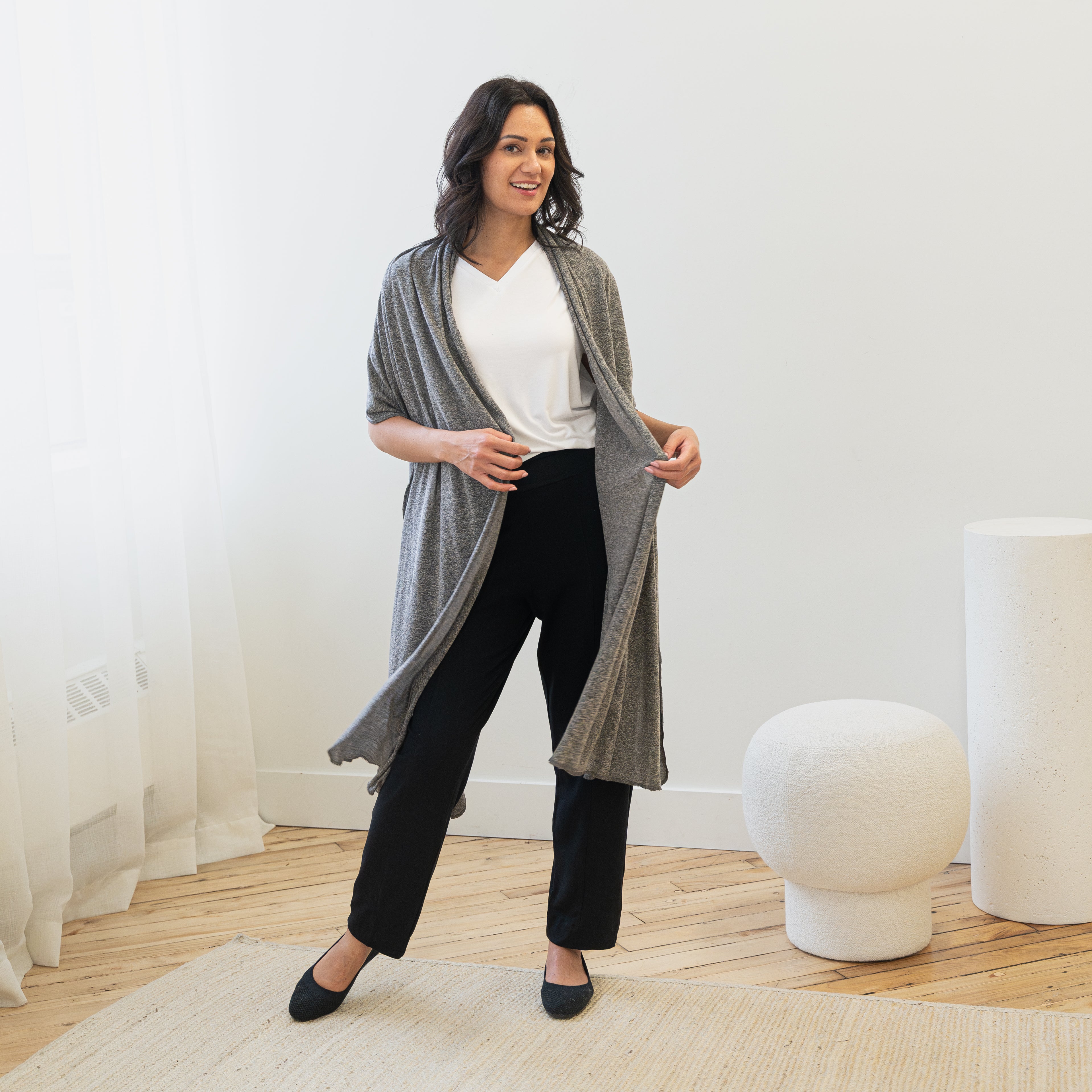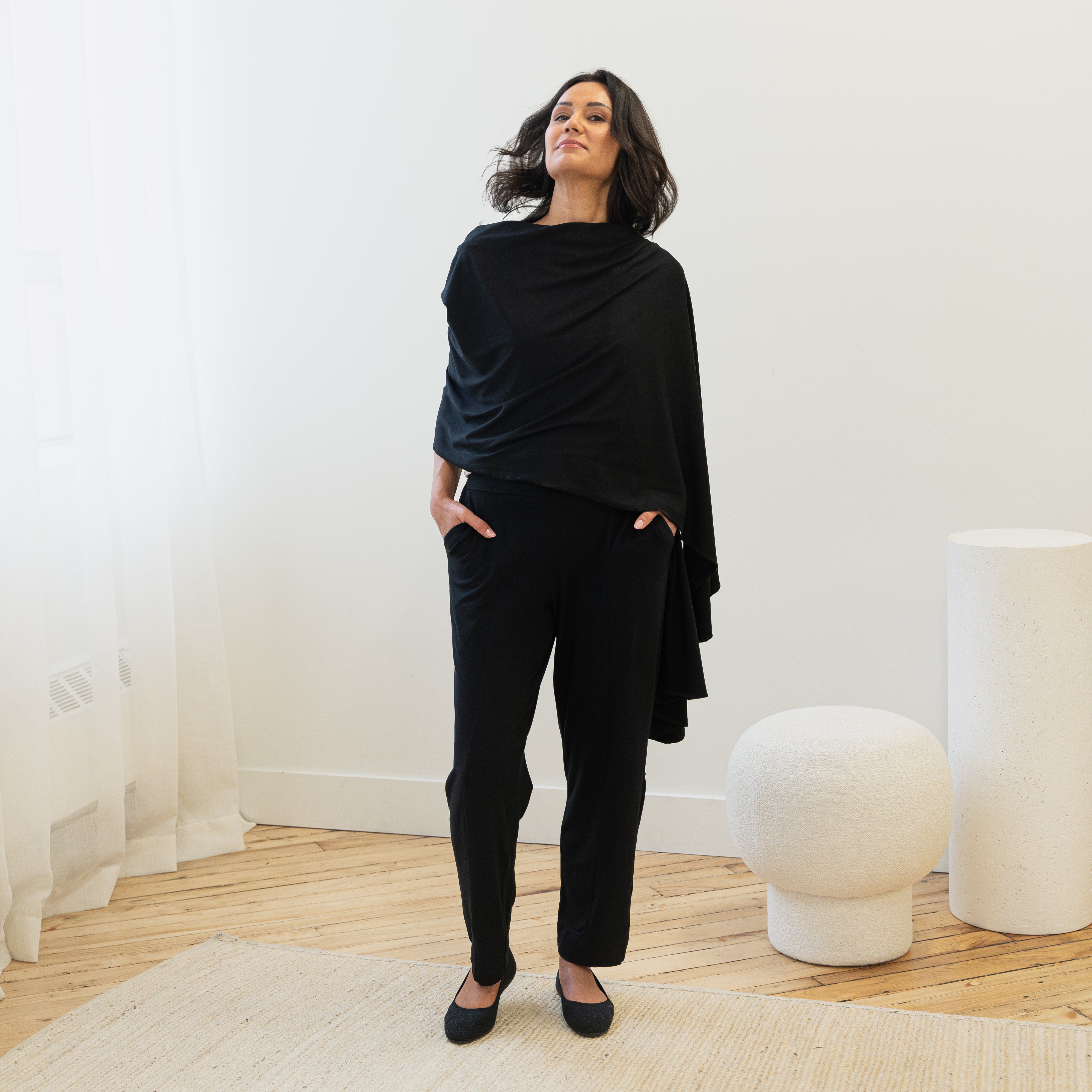The Jetsetter Wrap is made from TENCEL™ Lyocell Merino Wool Stretch Jersey, a blend of 65% TENCEL™ Lyocell, 28% Merino Wool, and 7% Spandex. Naturally thermoregulating, odour-resistant, and luxuriously soft, this lightweight fabric is easy to pack and keeps you warm without overheating—perfect for any climate.