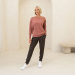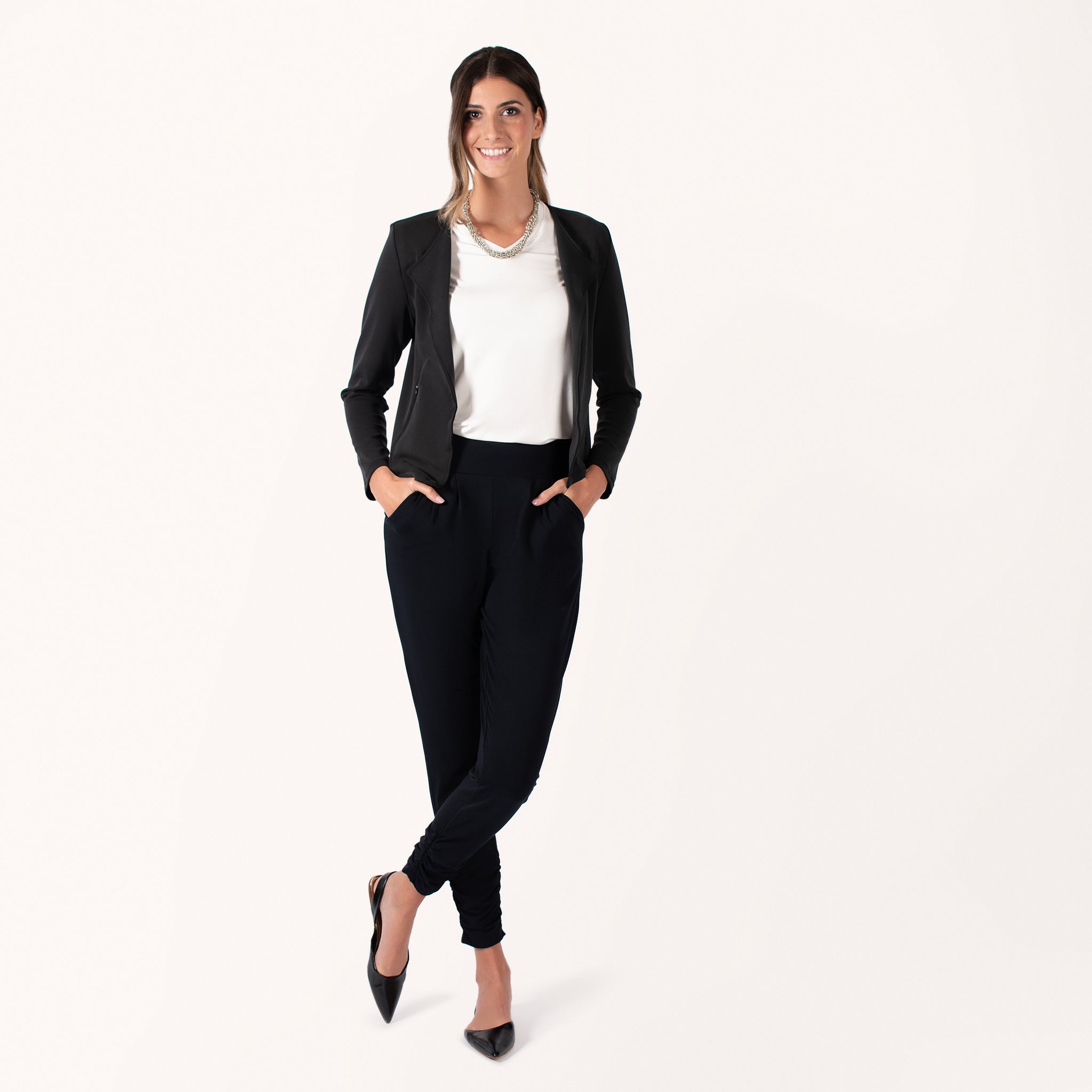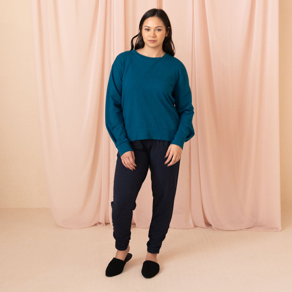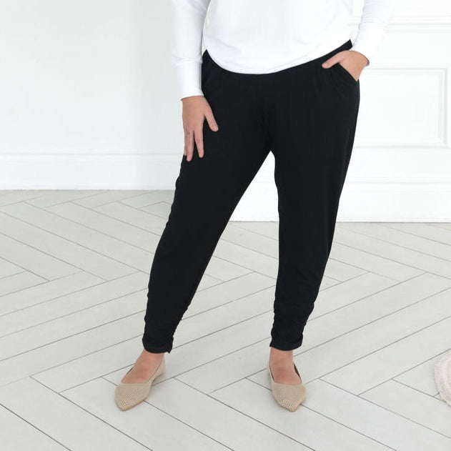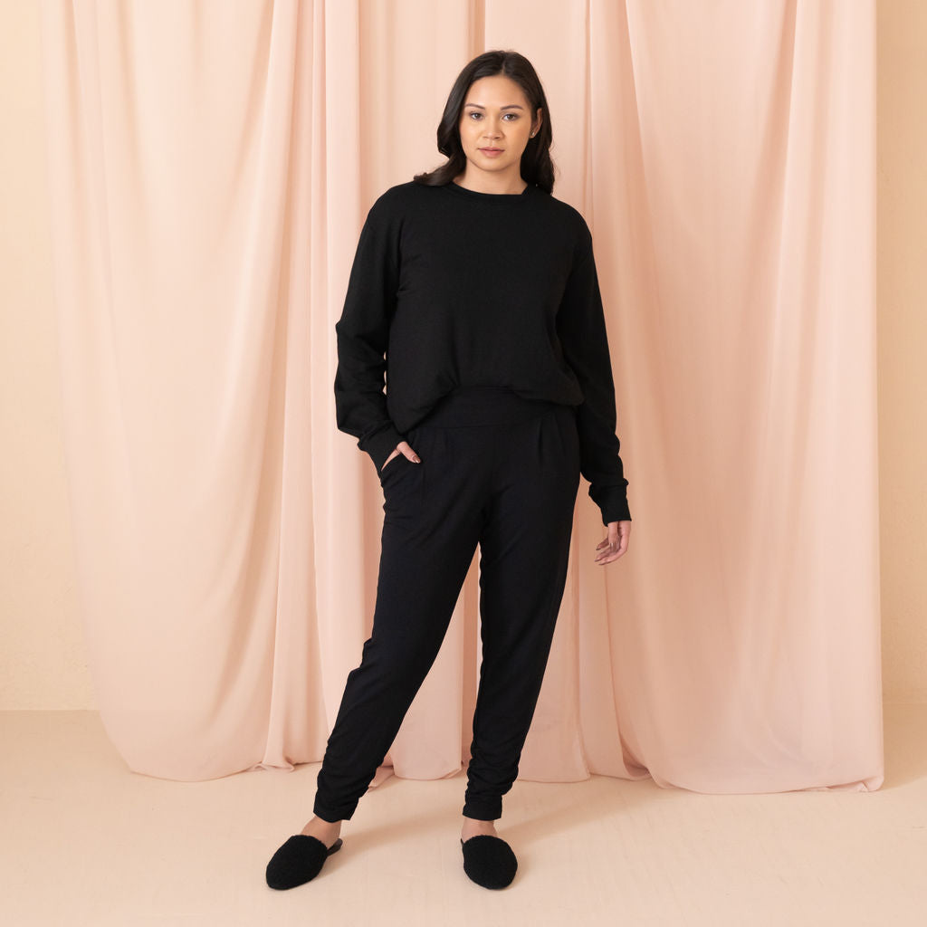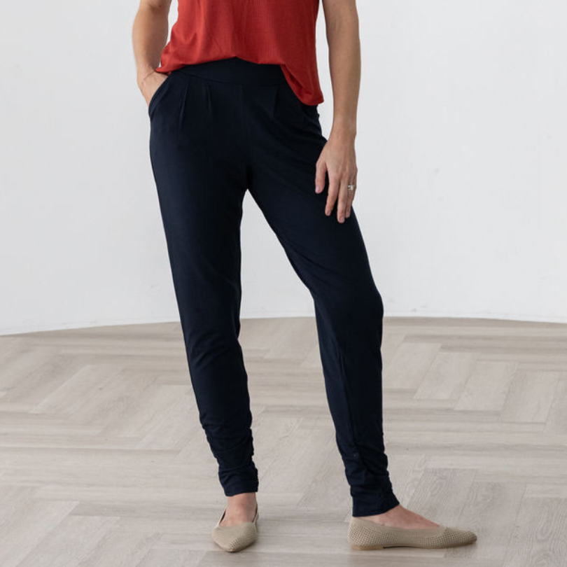 Our Dressy Sweatpants are made from a blend of MicroModal Lycra. This sustainable fabric is knit and dyed locally in Toronto. MicroModal is an eco-friendly yarn that's 3 times softer than cotton but more resilient, uses less water to produce and chemicals used are recycled within the process, and never released into the environment.