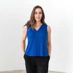 A woman wearing a blue sleeveless top with a round neckline, in a room with a white background.