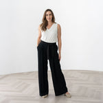 Woman wearing a teal sleeveless top and black pants standing against a beige curtain.
