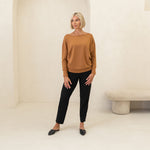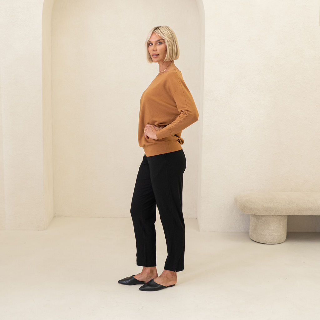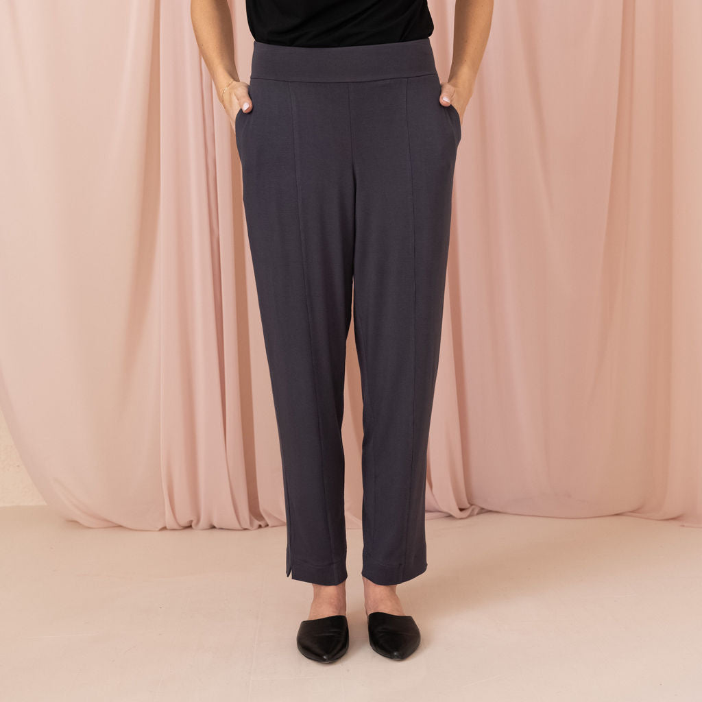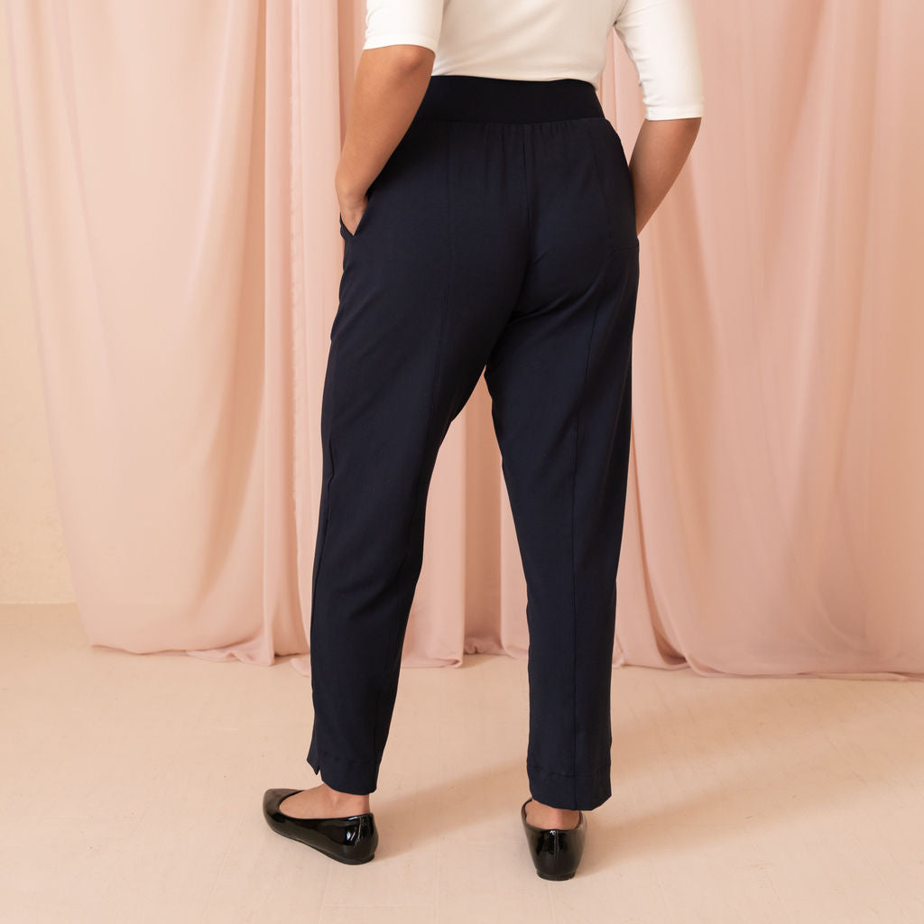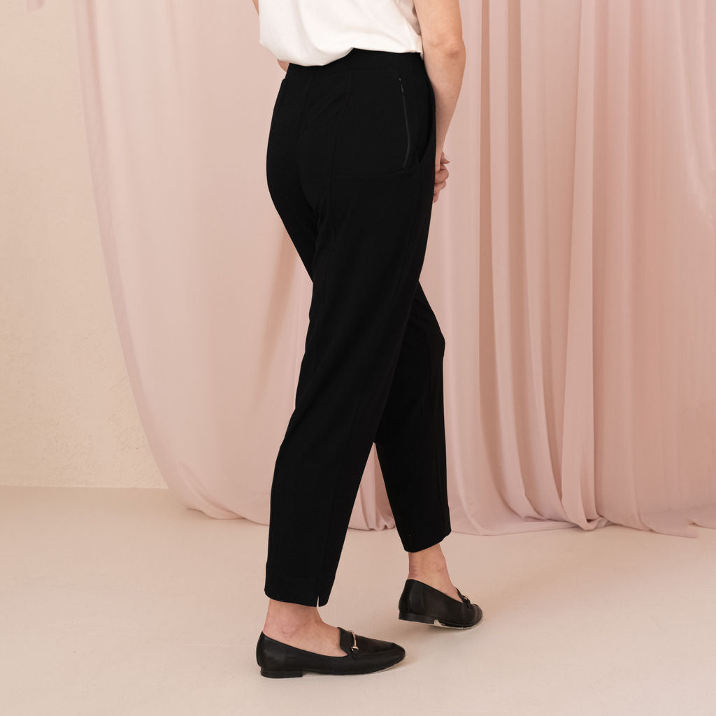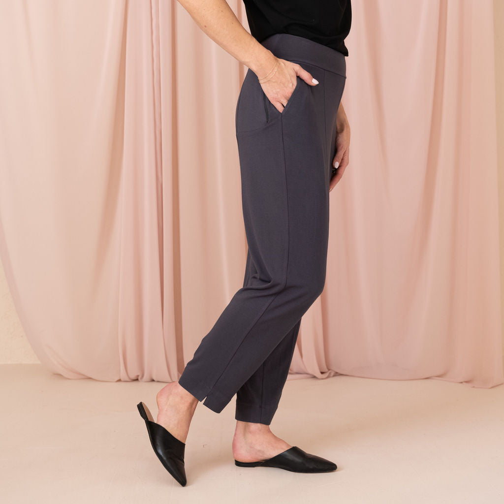 Meet your chic travel essential: the Wanderer Pant. Mid-rise with a tapered, straight leg for timeless elegance, designed with a comfortable, no-pinch elastic waist. Features two side pockets and a secret passport zip pocket, perfect for on-the-go. Made from buttery-soft, four-way stretch MicroModal Jersey in Toronto, offering unmatched comfort around the clock (and globe).