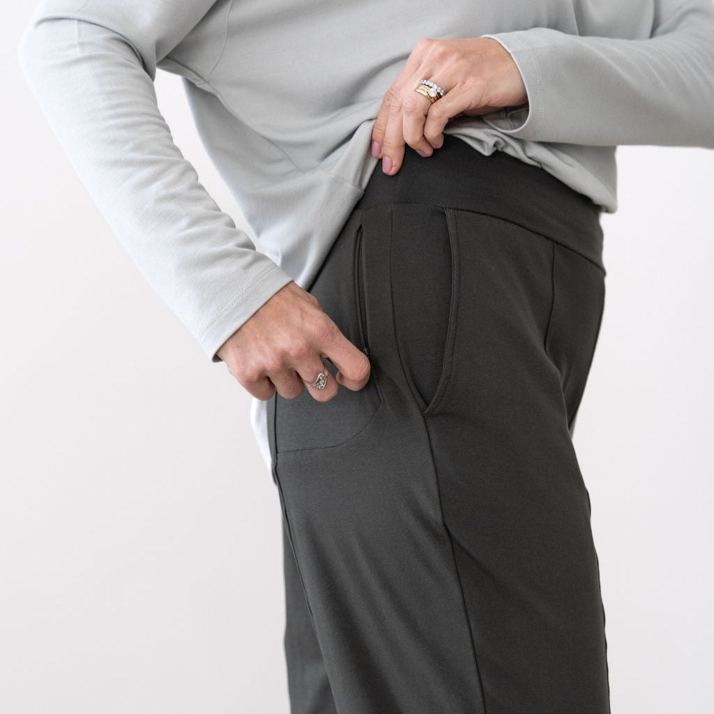 All styles are ethically made in Toronto from OEKO-TEX® certified, heavyweight MicroModal Lycra jersey—smooth, stretchy, and sustainably produced. Each pair features deep pockets (including a secure zippered pocket for your phone or passport), a wide contoured waistband for comfort, and thoughtful details to suit your style.