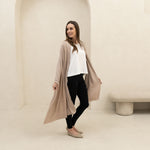 The Jetsetter Wrap is made from TENCEL™ Lyocell Merino Wool Stretch Jersey, a blend of 65% TENCEL™ Lyocell, 28% Merino Wool, and 7% Spandex. Naturally thermoregulating, odour-resistant, and luxuriously soft, this lightweight fabric is easy to pack and keeps you warm without overheating—perfect for any climate.