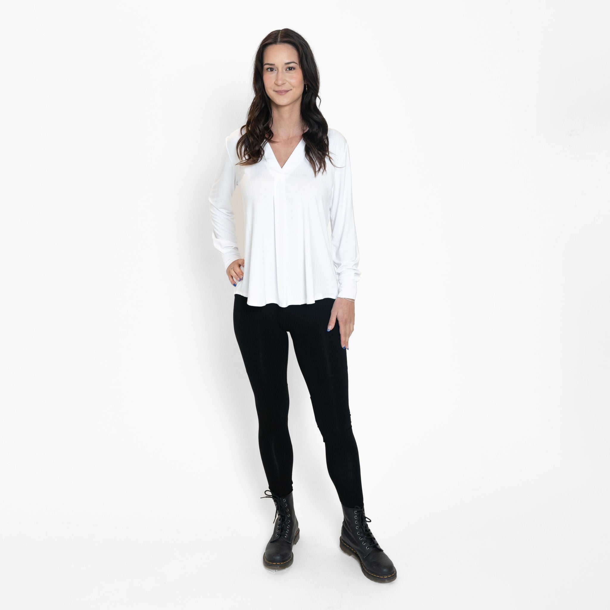 Woman wearing a loose flowing white v-neckline shirt with black leggings