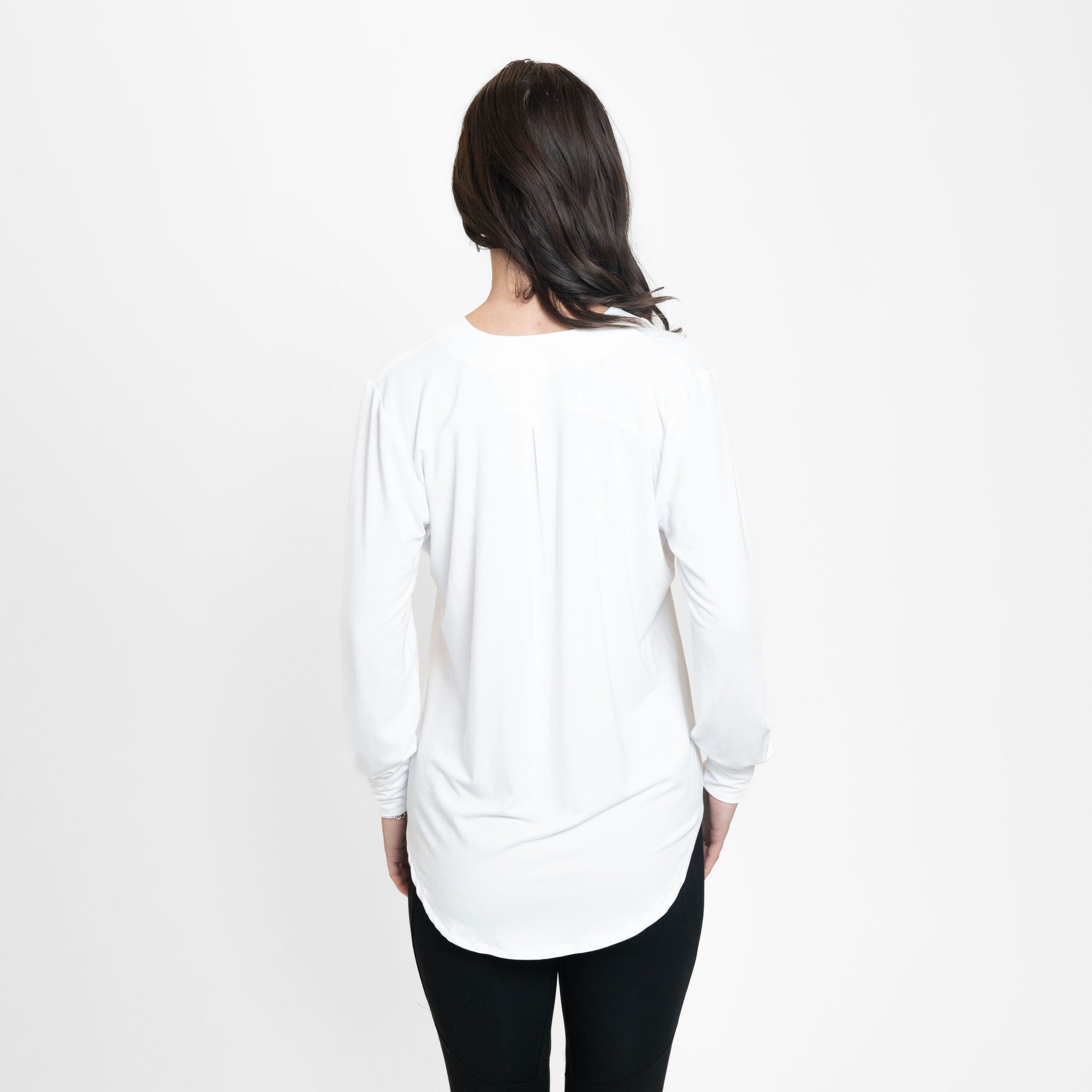 All business (from the waist-up at least). Our Comfy Dress Shirt is the perfect marriage between a tailored shirt and your favourite PJs. Made from soft, sustainable, silky Modal, it features a v-neckline, front pleat and versatile, flattering length. Finally, a dress shirt that’s actually comfortable.