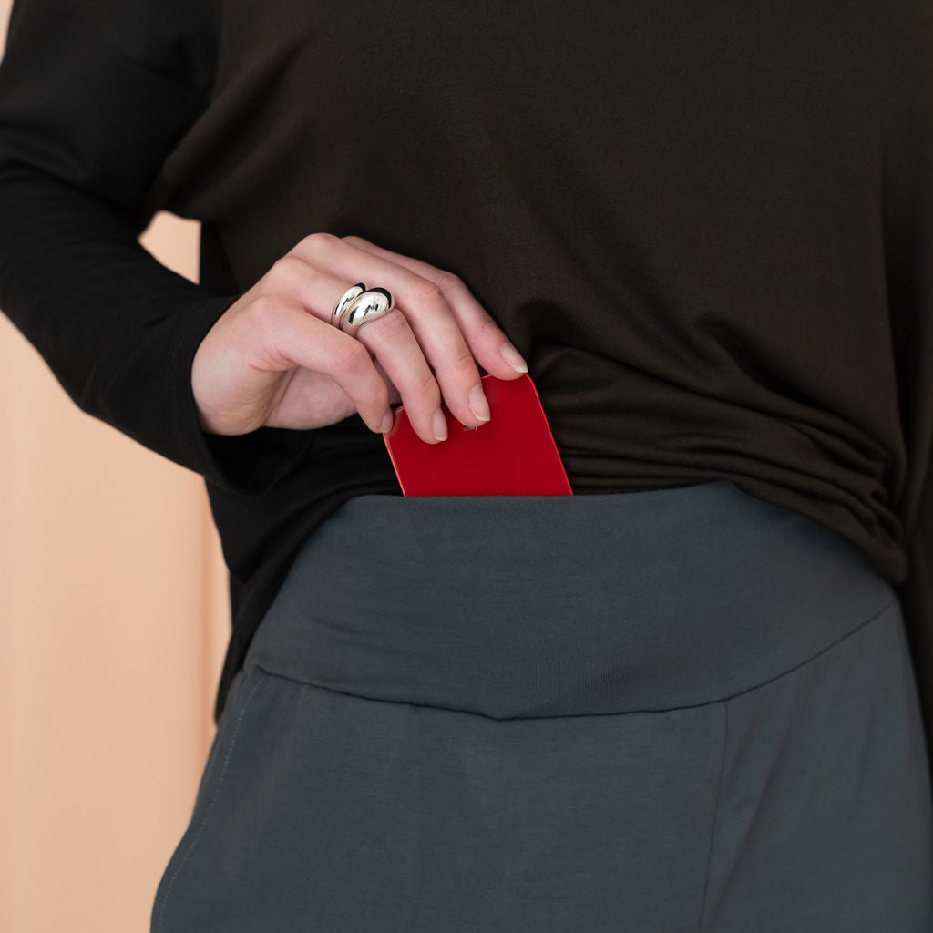• Hidden waistband pocket for smaller items such as cards or keys.