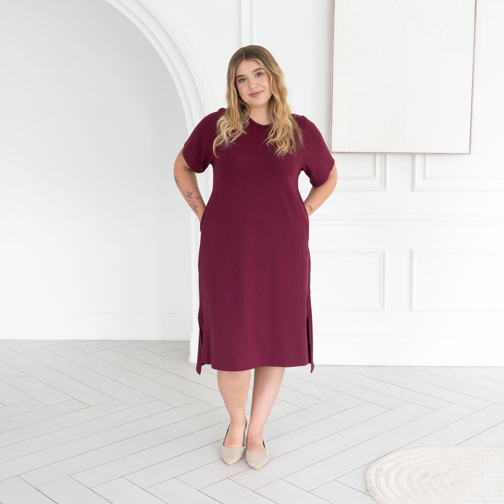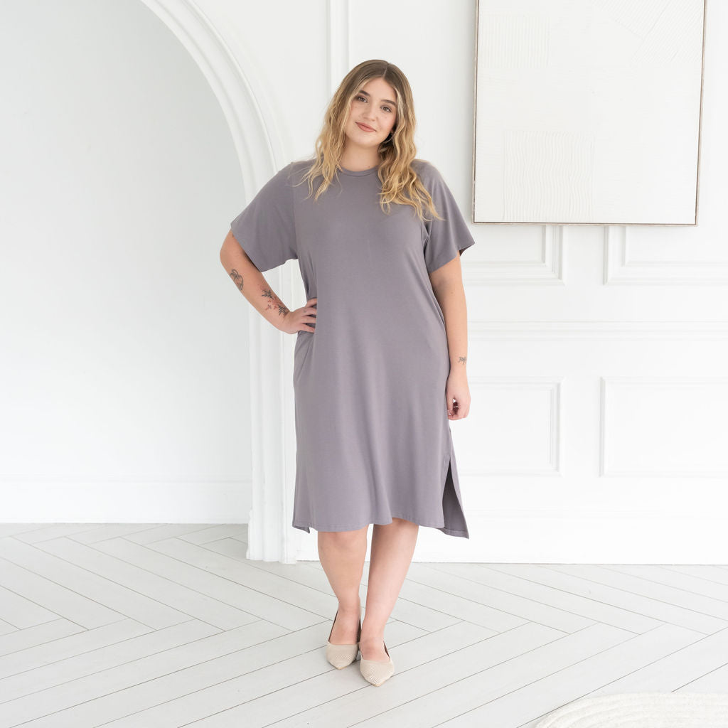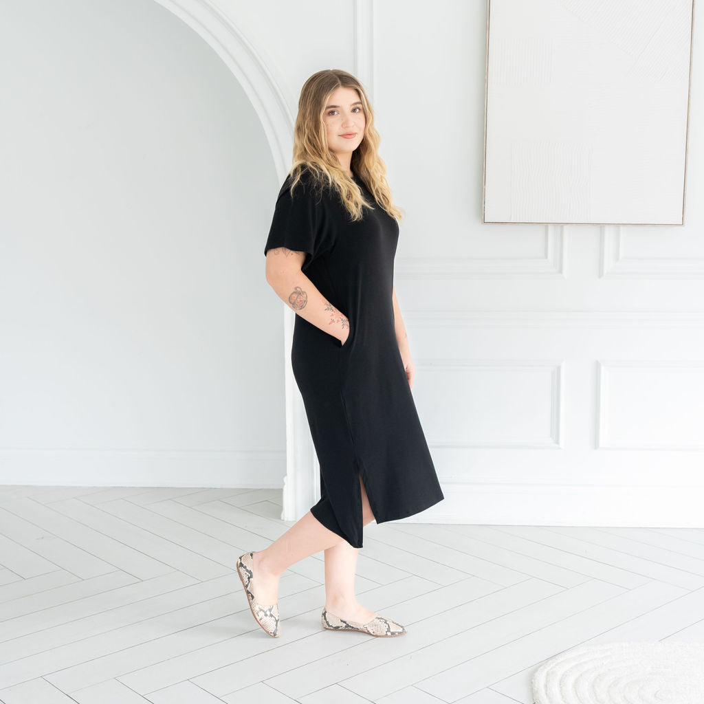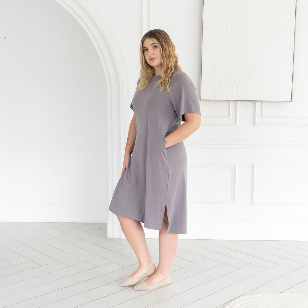 The All Day Midi T-Shirt Dress combines comfy T-shirt vibes with an effortlessly elevated silhouette. With a soft drape, flattering high-low hem, and modern longer short sleeves, it moves with you from workdays to weekends. Crafted in our breathable Bamboo cotton blend fabric— this is the kind of dress you live in. It's your everyday uniform, upgraded.