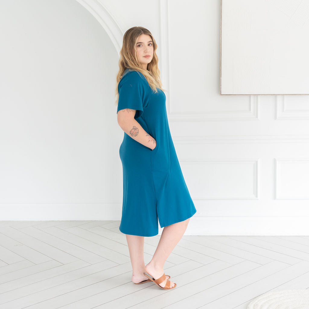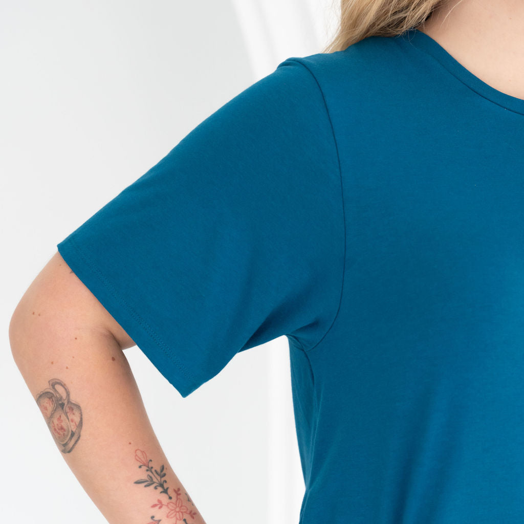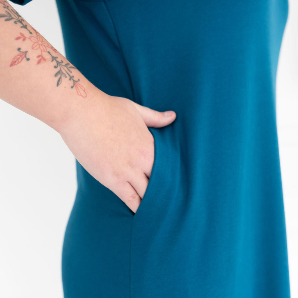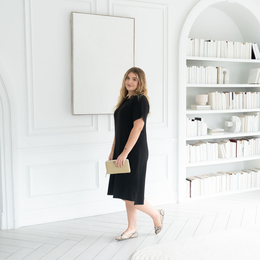 The All Day Midi T-Shirt Dress combines comfy T-shirt vibes with an effortlessly elevated silhouette. With a soft drape, flattering high-low hem, and modern longer short sleeves, it moves with you from workdays to weekends. Crafted in our breathable Bamboo cotton blend fabric— this is the kind of dress you live in. It's your everyday uniform, upgraded.
