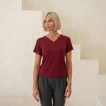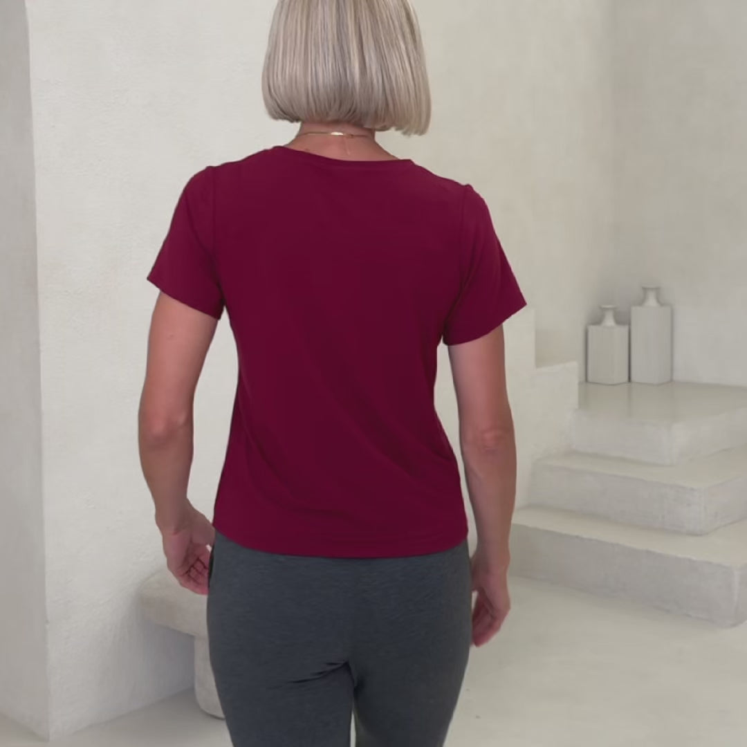 The Going Places V-Neck is made from the same breathable, cooling fabric as our Effortless Tees and Revolve Dress 3.0 (solid colours). It’s a blend of 95% Rayon from Bamboo and 5% Spandex. The Rayon from Bamboo is sourced sustainably and is OEKO-TEX® STANDARD 100 certified, meaning it’s free from harmful chemicals. The fabric is soft, naturally thermo-regulating, mid-weight, and perfect for keeping you comfortable all day or night.