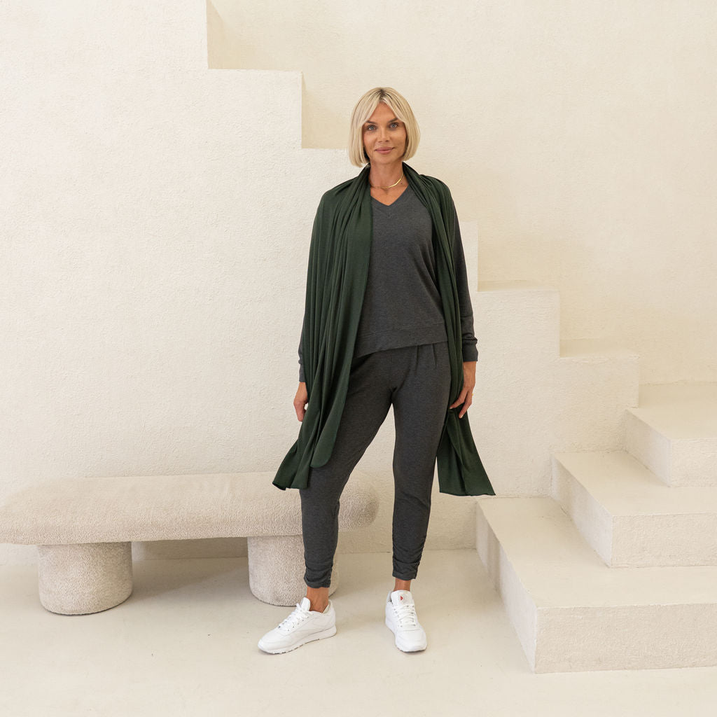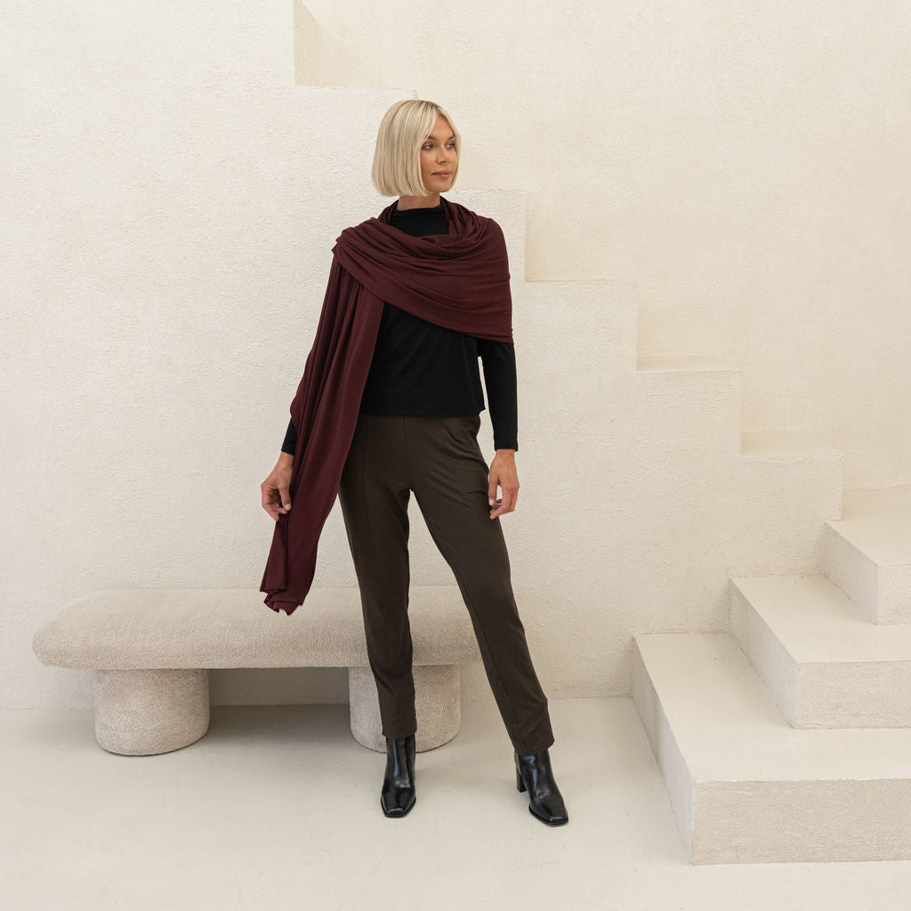 The Jetsetter Wrap is made from TENCEL™ Lyocell Merino Wool Stretch Jersey, a blend of 65% TENCEL™ Lyocell, 28% Merino Wool, and 7% Spandex. Naturally thermoregulating, odour-resistant, and luxuriously soft, this lightweight fabric is easy to pack and keeps you warm without overheating—perfect for any climate.